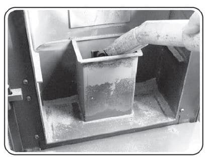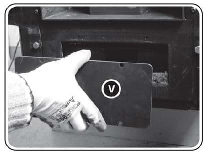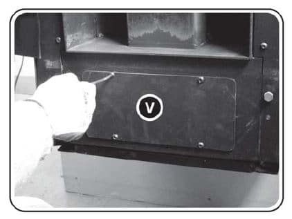 Dévissez le cache du compartiment de collecte de poussières (V) situé dans le bas du poêle à granulés, sous la porte. Videz le compartiment à l’aide d’une petite pelle, puis aspirez la suie et les cendres résiduelles.