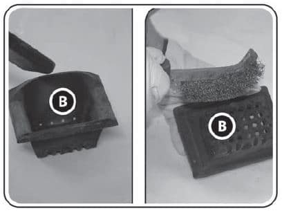 Sortez le brûleur (B) de son logement. Retirez les cendres ou la suie qui pourraient obturer les passages d’air, soit en frottant à l’aide d’une brosse en acier, soit en utilisant un aspirateur à cendres spécifique.