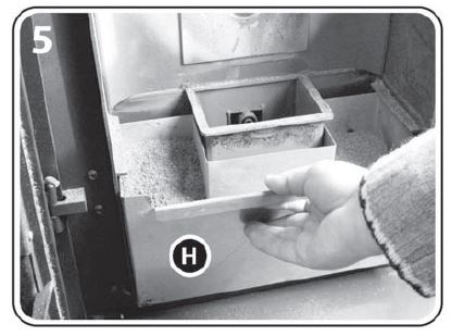 Retirez le cendrier (H) de la chambre de combustion, et videz les cendres qu’il contient dans un container métallique adapté. En utilisant un aspirateur à cendres spécifique, aspirez les cendres résiduelles du cendrier. Aspirez également tout la cendre qui s’est déposée dans le compartiment du cendrier ou sur la porte du poêle à pellets.