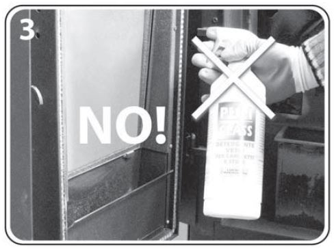 Le nettoyage est un moment sensible, car il ne faut surtout pas endommager la vitre ou l’appareil. Nous vous recommandons donc d’utiliser des produits adaptés. Évitez les éponges ou de chiffons abrasifs. Ils rayent la vitre de manière irréversible. Ne pulvérisez jamais de produit à vitre directement sur la vitre (3) pour éviter qu’il ne coule sur les joints ou les surfaces métalliques de votre appareil. La meilleure technique de nettoyage de la vitre consiste à pulvériser une petite quantité de nettoyant sur un chiffon doux (1) et de frotter ensuite les surfaces encrassées (2).