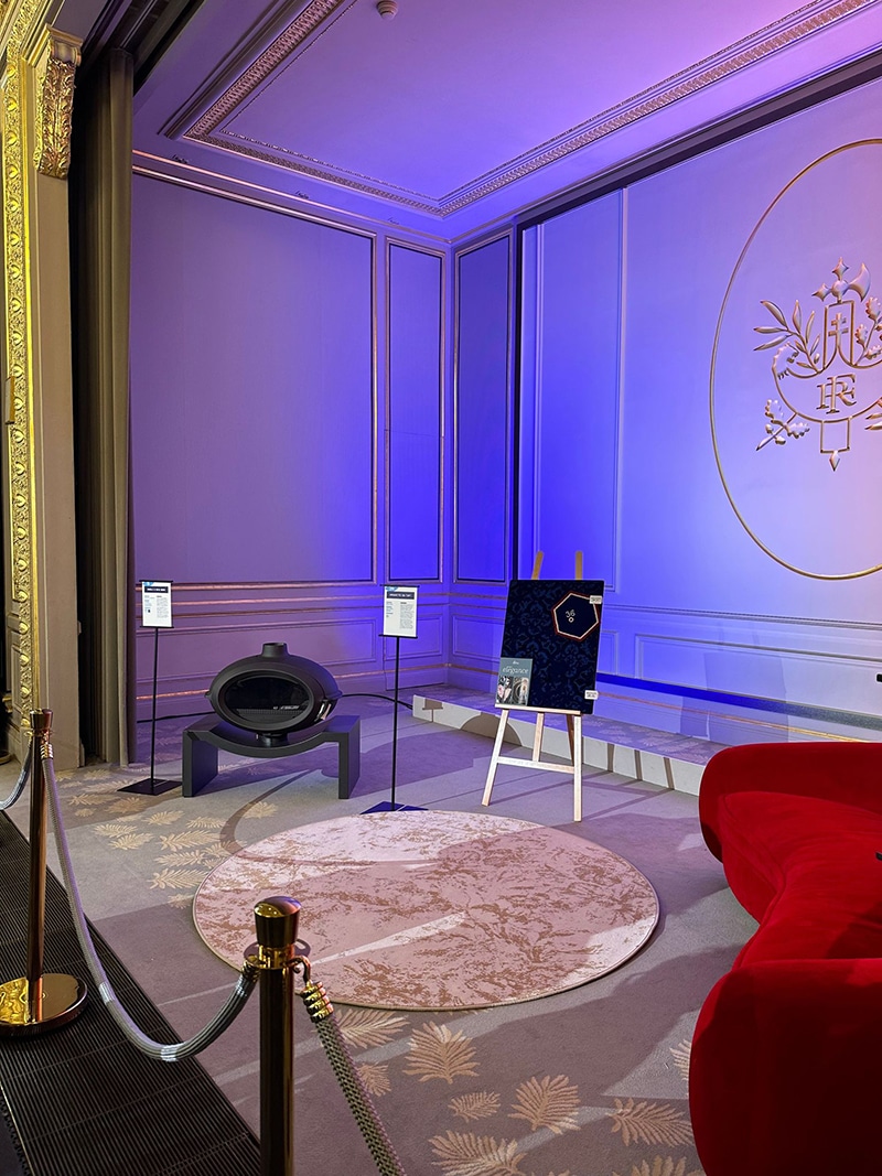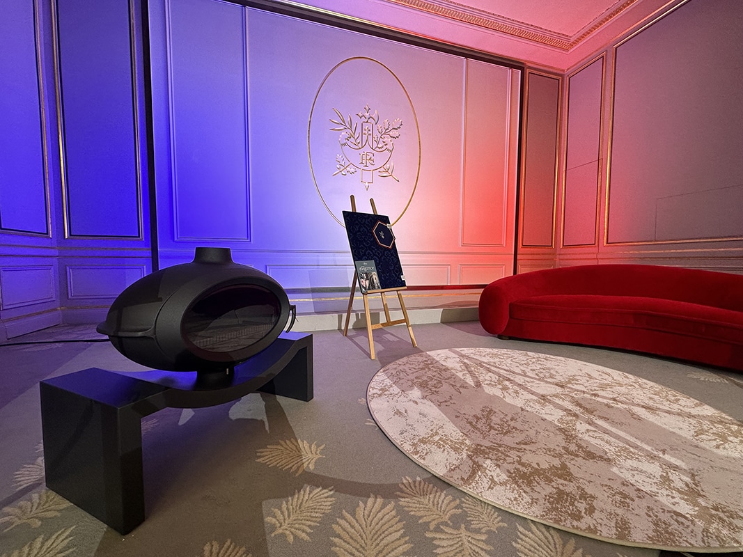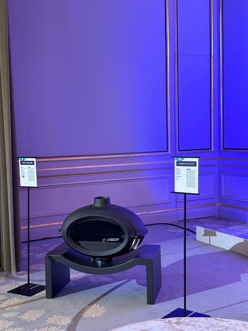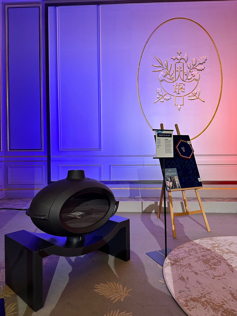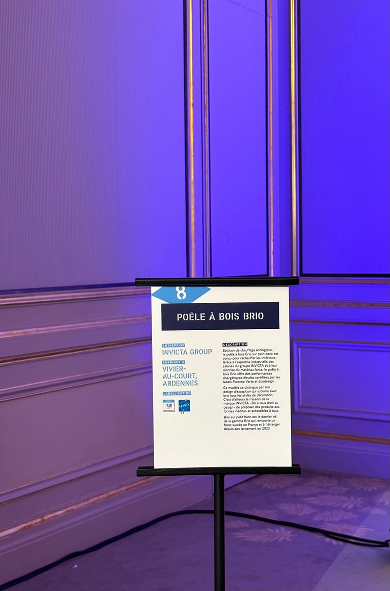 Palais de l’Élysée, 1er et 2 juillet 2023, le nouveau poêle à bois Brio sur petit banc INVICTA représente le département des Ardennes lors de la “Grande Exposition du Fabriqué en France”.