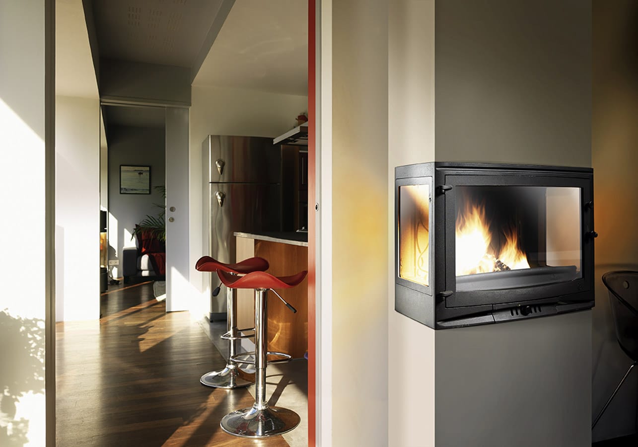 Le système vitre propre permet de ralentir l’encrassement du vitrage. Une arrivée d’air sur le haut de la vitre crée un voile de protection. L’ air préchauffé est propulsé le long du vitrage. Il déclenche la combustion des gaz et des matières volatiles protégeant ainsi la vitre contre la fumée et le dépôt de suie.