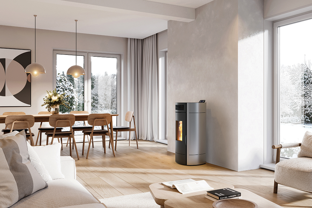 Poêle à granulés équipé du WiFi en série pour piloter l’appareil à distance depuis un smartphone ou une tablette et via une application dédiée.