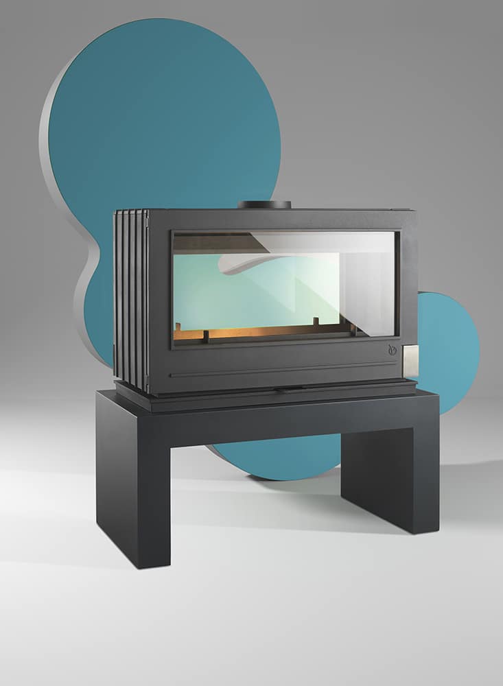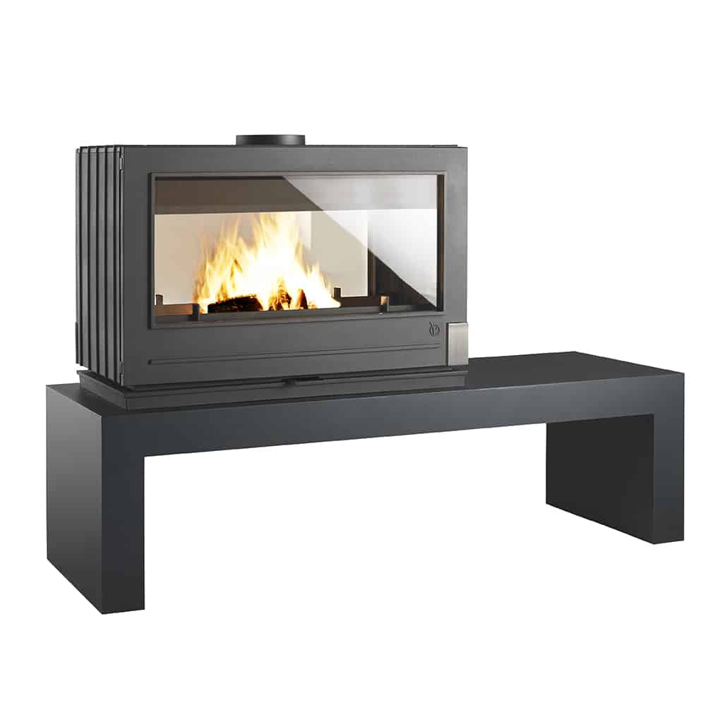 Plus la peine de jouer à pile ou face, le poêle Aaron vous offre une vision double face. Posé directement sur un matériau brut tel que la pierre ou sur un banc proposé en option, ce poêle grande vision accueille de grandes bûches. Banc disponible en 2 dimensions.